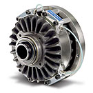 Wenn Sie die Abziehleistung mit 1 PS annehmen und sie haben ein Aufbauverhältnis von 10:1, benötigen Sie einen 10 PS Motor und Antrieb. Dies stimmt sowohl für eine direkte Drehmomentregelung des Motors als auch für eine Kupplung mit variabler Drehzahleingabe. Gute AC oder DC Motorregler machen es möglich, mit 100 Hz oder Feldschwächung zu arbeiten, wodurch man die Motorleistung halbieren kann, in diesem Falle auf 5 PS. Jedoch kommt es bei der Verarbeitung von dünnen Filmen oder Profilbahnen mit sehr geringer Spannung bei mit hohen Drehzahlen laufenden Motoren durch die Feldschwächung oder der hohen Frequenz bei einem AC VFD (Wechselstromantrieb mit veränderlicher Frequenz) zu einem anderen Problem. Wir haben zwar mehr an Leistung bei einem Einsatz eines kleineren Motors (5PS) gewonnen, der aber mit doppelter Drehzahl läuft! Man muss jetzt jedoch die Drehzahl mit einem Getriebe auf die an der Wicklereingangswelle erforderliche Drehzahl reduzieren. Hierdurch erhält man an der Aufwickelwelle eine größere Schwungmasse (ähnlich einem Schwungrad), einen Verlust durch den Getriebewirkungsgrad usw. Durch den Einbau einer kleinen Kupplung mit geringer Schwungmasse zwischen der Aufwickelwelle und dem Wicklerantriebsstrang kann man die Aufwickelfunktion vom Antrieb und somit von den vielen Variablen trennen, die sonst auf die aufzuwickelnde Bahn übertragen würden. Mit einer kleinen Kupplung erhält man in 40 Millisekunden oder weniger eine große Änderung des Ausgangsdrehmoments!